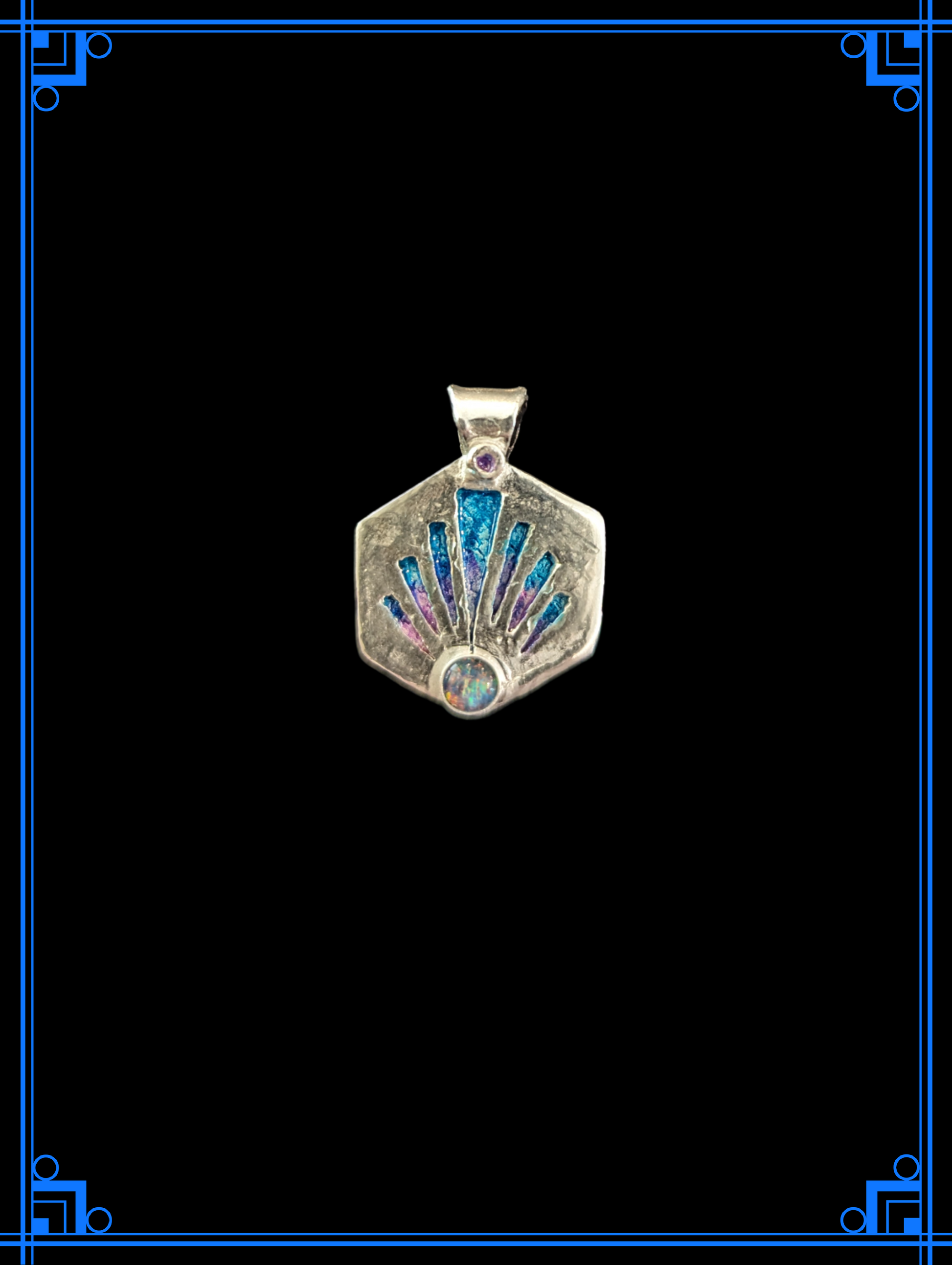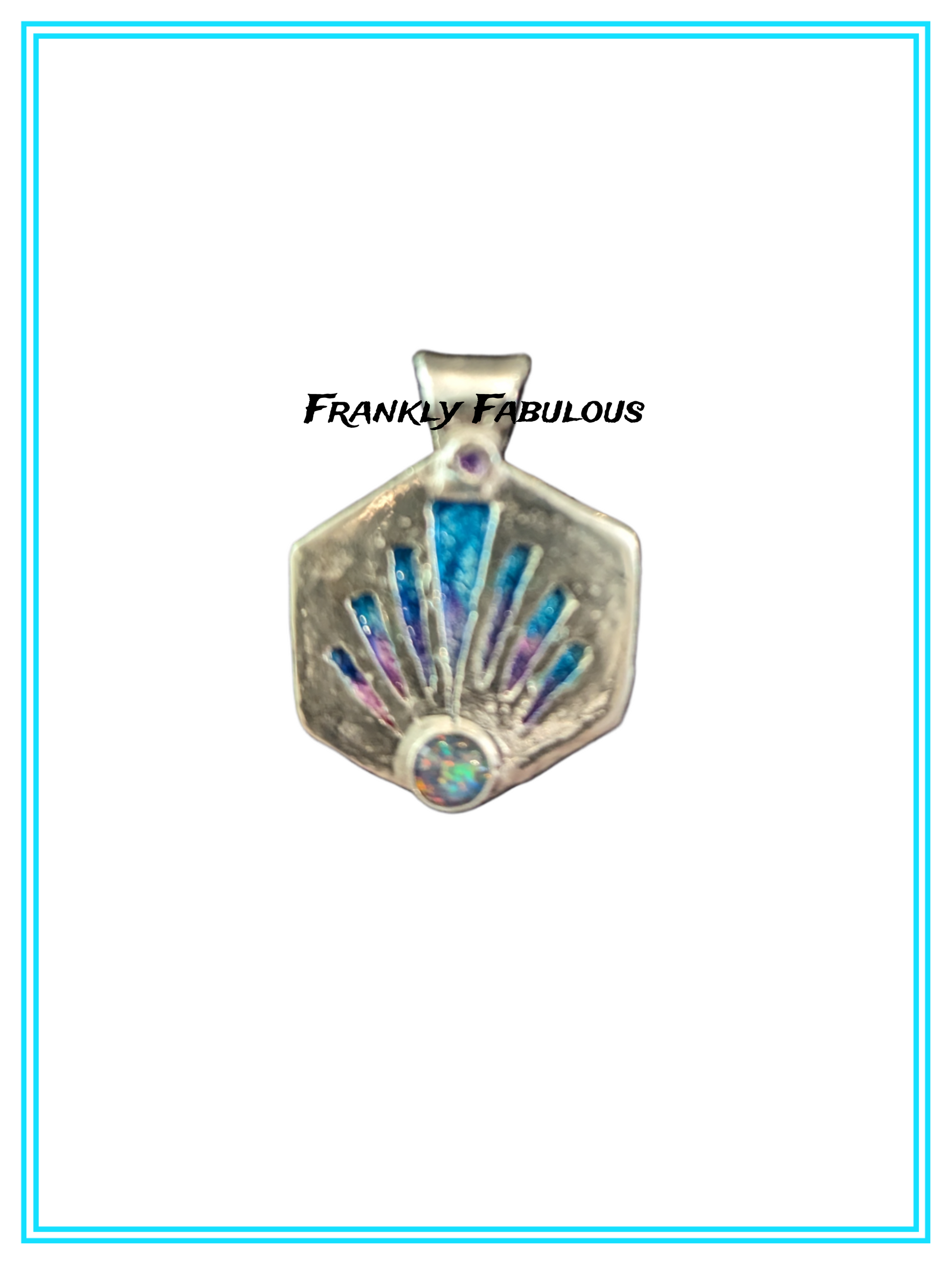 The colors in this fabulous Australian Opal are repeated in the fan on the pendant. Such a beautiful mix of blues and pinks. It measures roughly 1 inch X 1 1/4 inches. This one of a kind pendant can be yours.