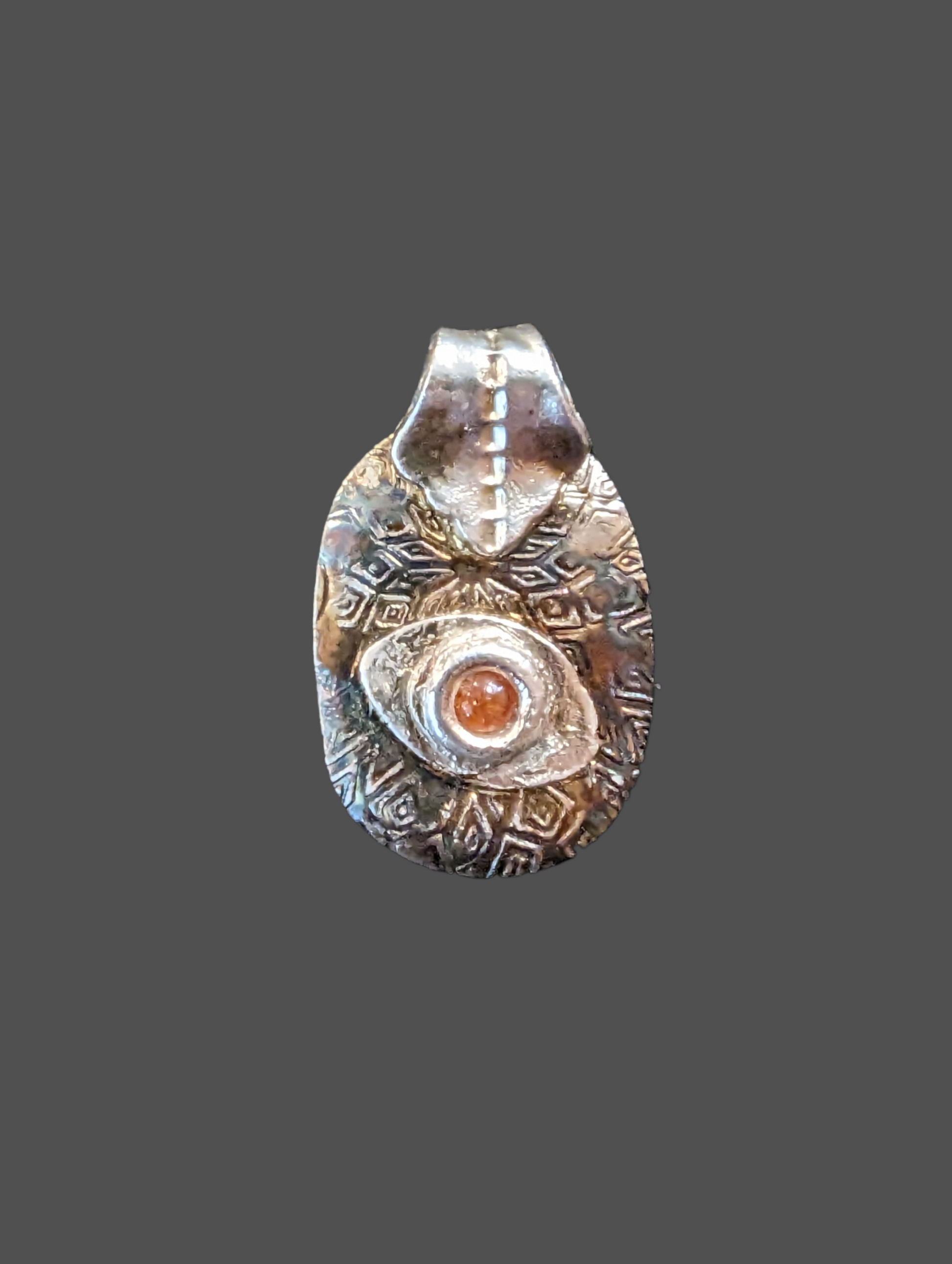 Fantastic Patina Colors! This is a fun, eye-catching pendant. The gemstone is Tanzanian Sunstone, set in pure silver.