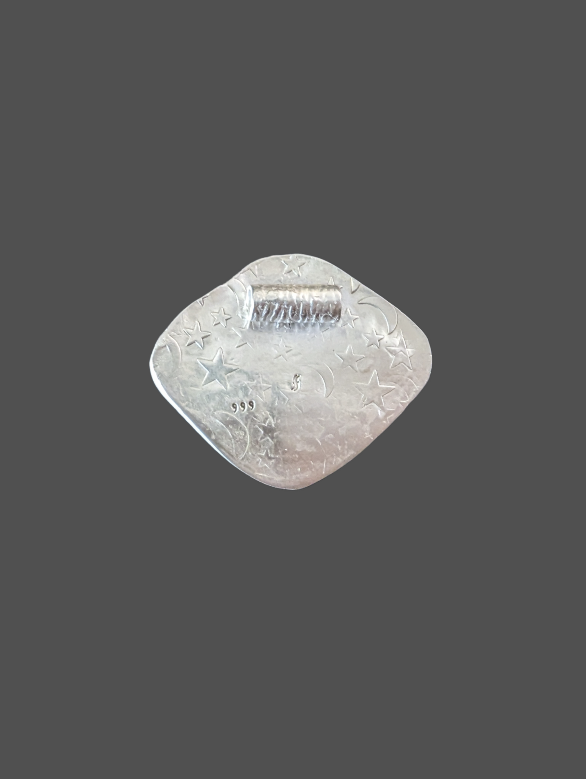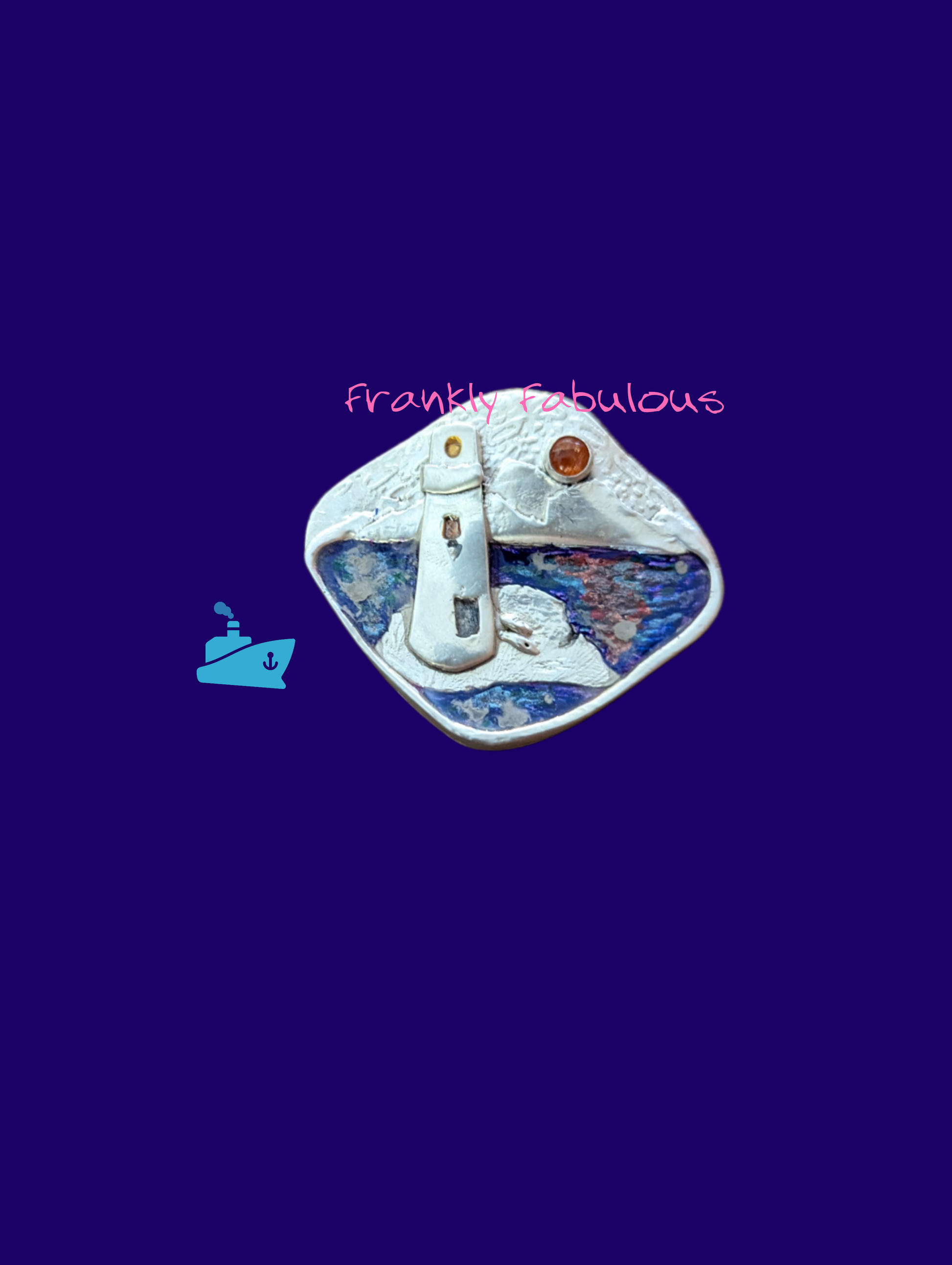 This lighthouse is a piece to treasure. At 23 grams of pure silver, it is about 2 inches wide and 1.5 inches tall. A Tanzanian sunstone is just appearing above the mountains, and it's color is reflected in the water. Hand made, hand painted, and frankly, fabulous!