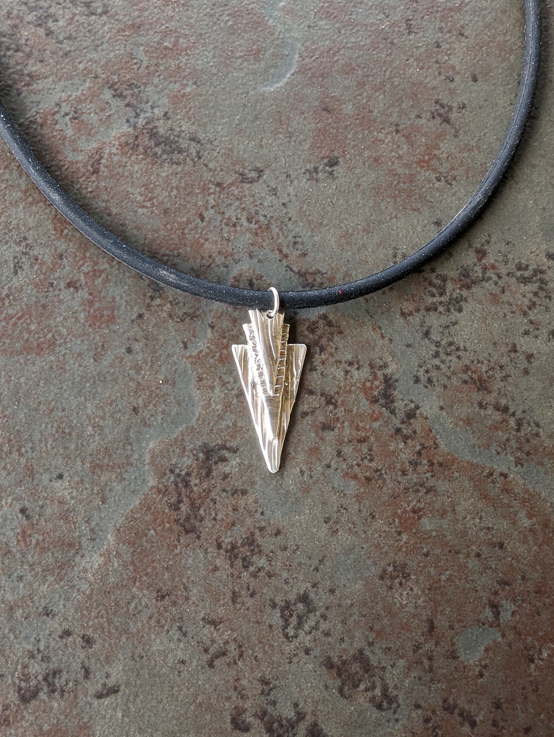 Here's the Point! Three layers of textured pure silver. Very attractive on the black silicone cord, very cute as a charm on the collar of your pet.