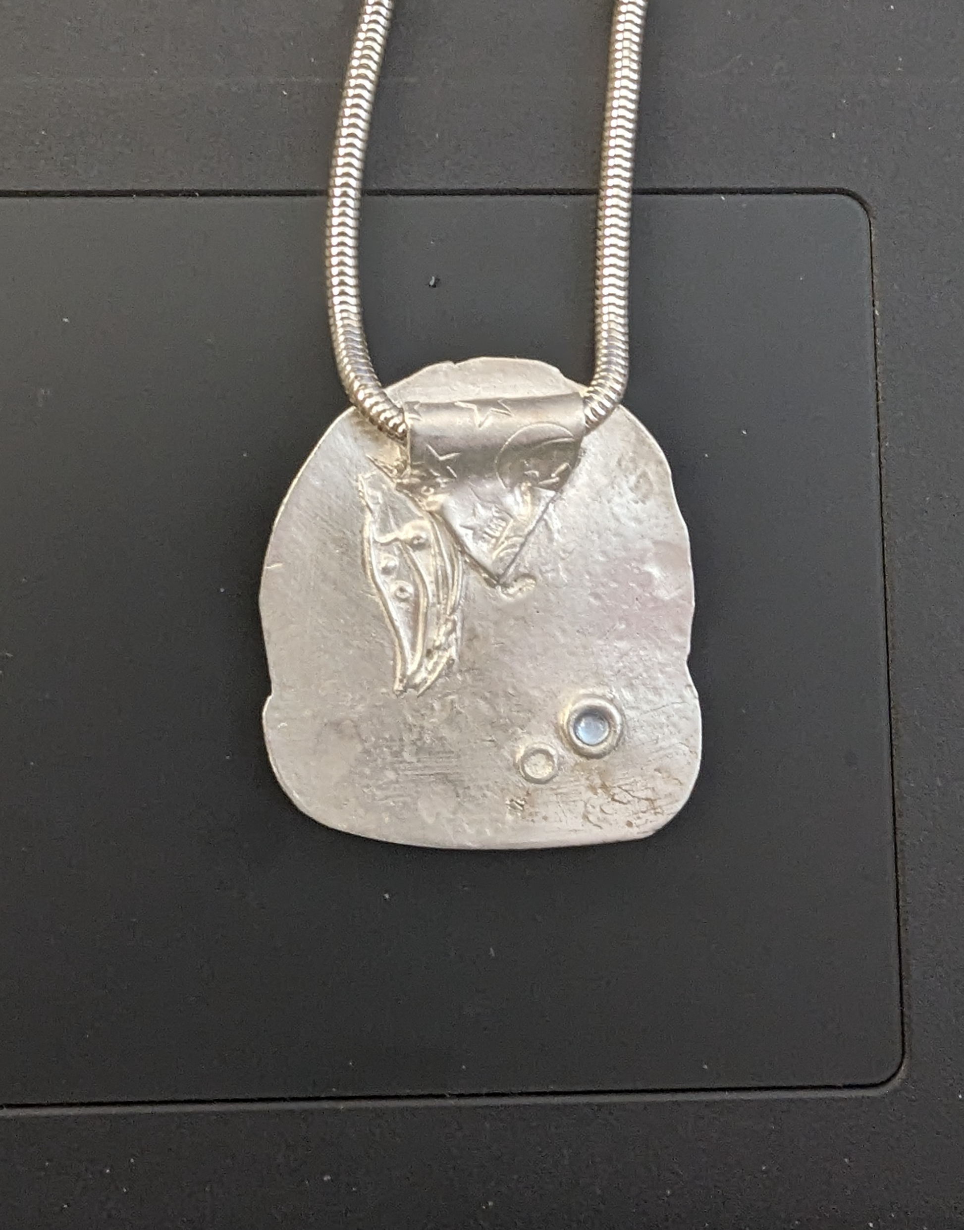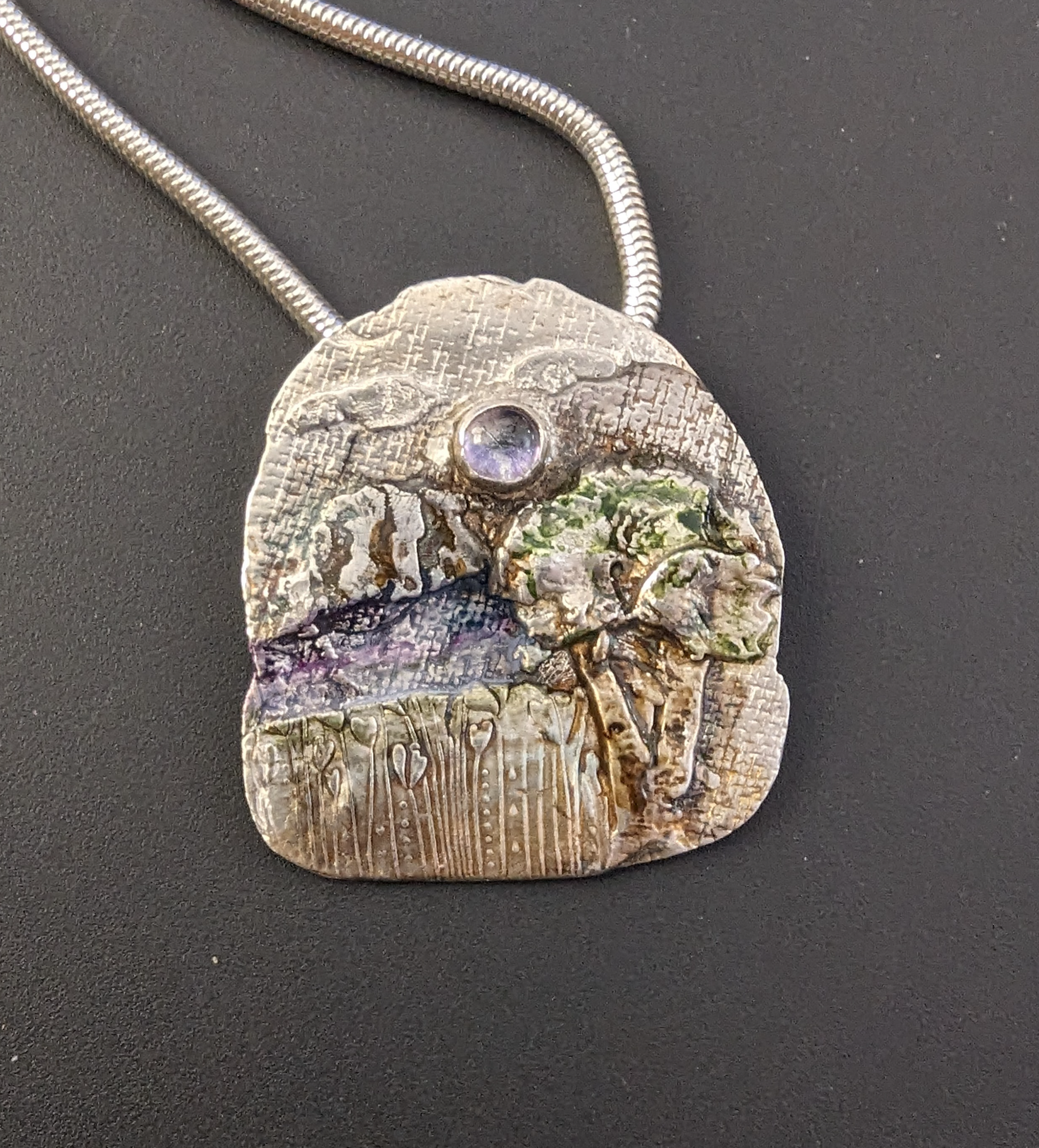 The faux alexandrite moon illuminates the scene with a wash of violet. Twenty-two grams of pure silver, one of a kind. About 1.75 inches tall and 1.5 inches wide. This is a one of a kind piece of wearable art.