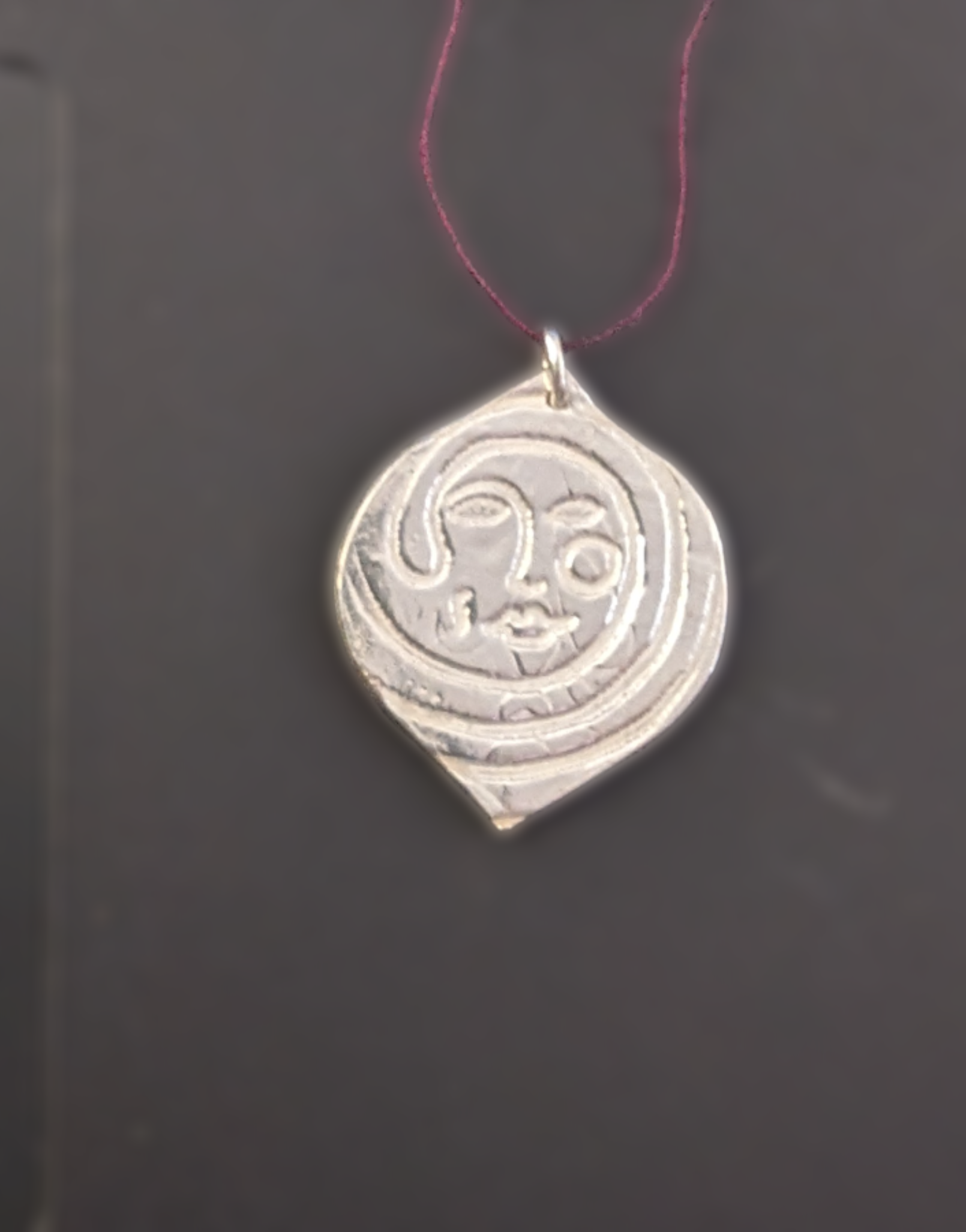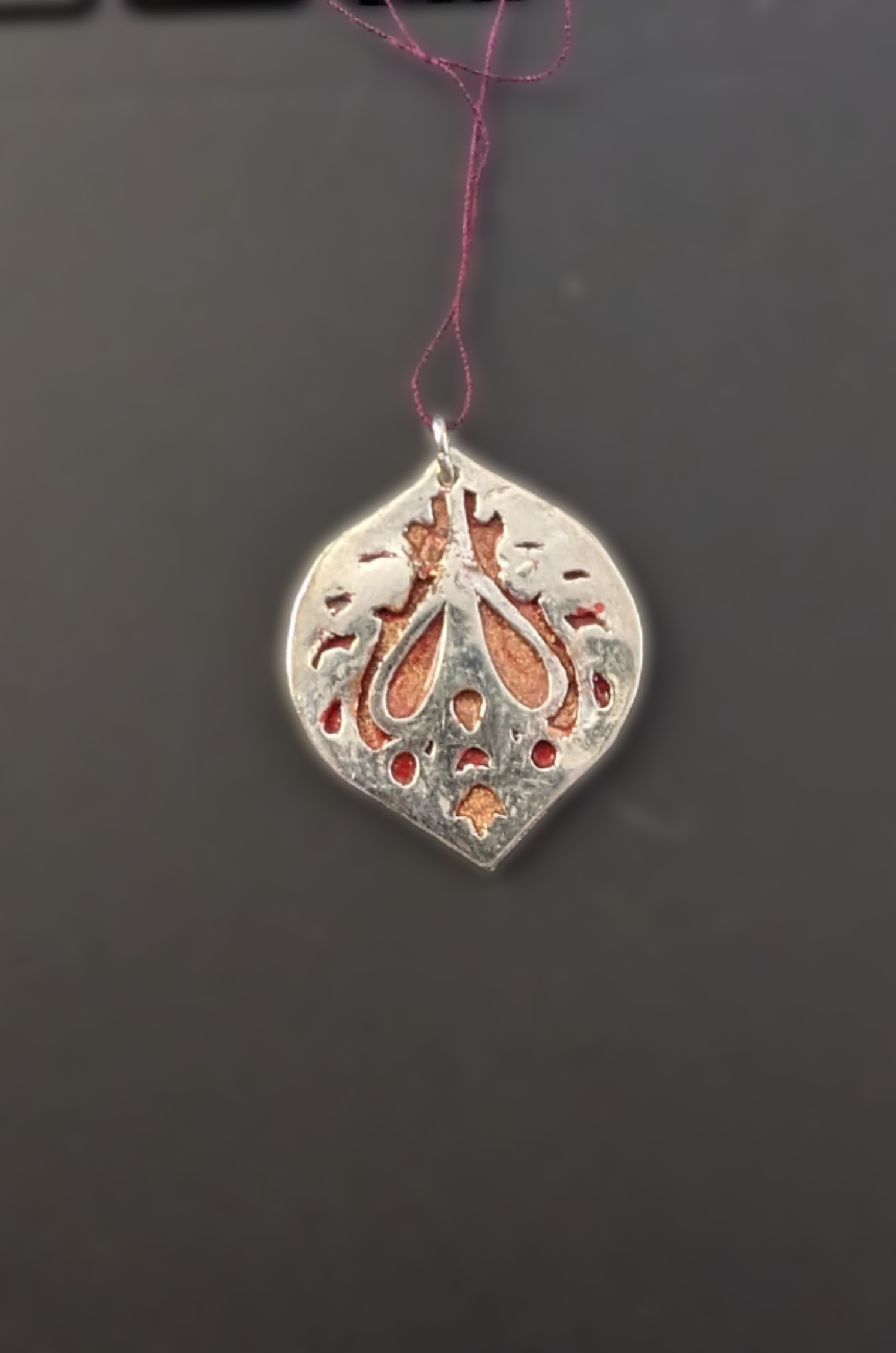 Two layers of pure silver. The hand painted background makes it look like rose gold. And the back!! Very cool! It measures about 1.25 inches high and 1" wide.
