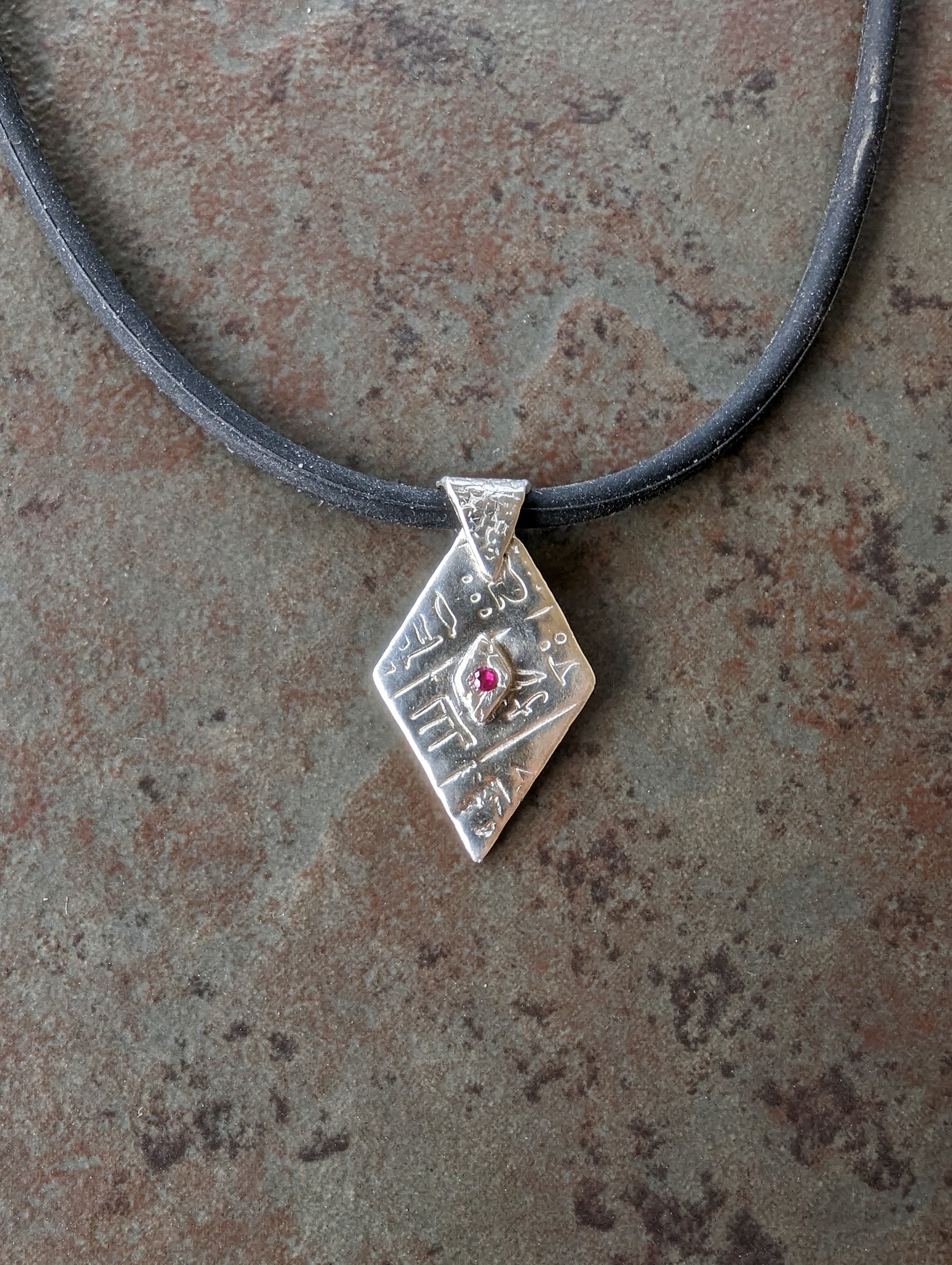 A very shiny pure silver pendant with a tiny faux red garnet.