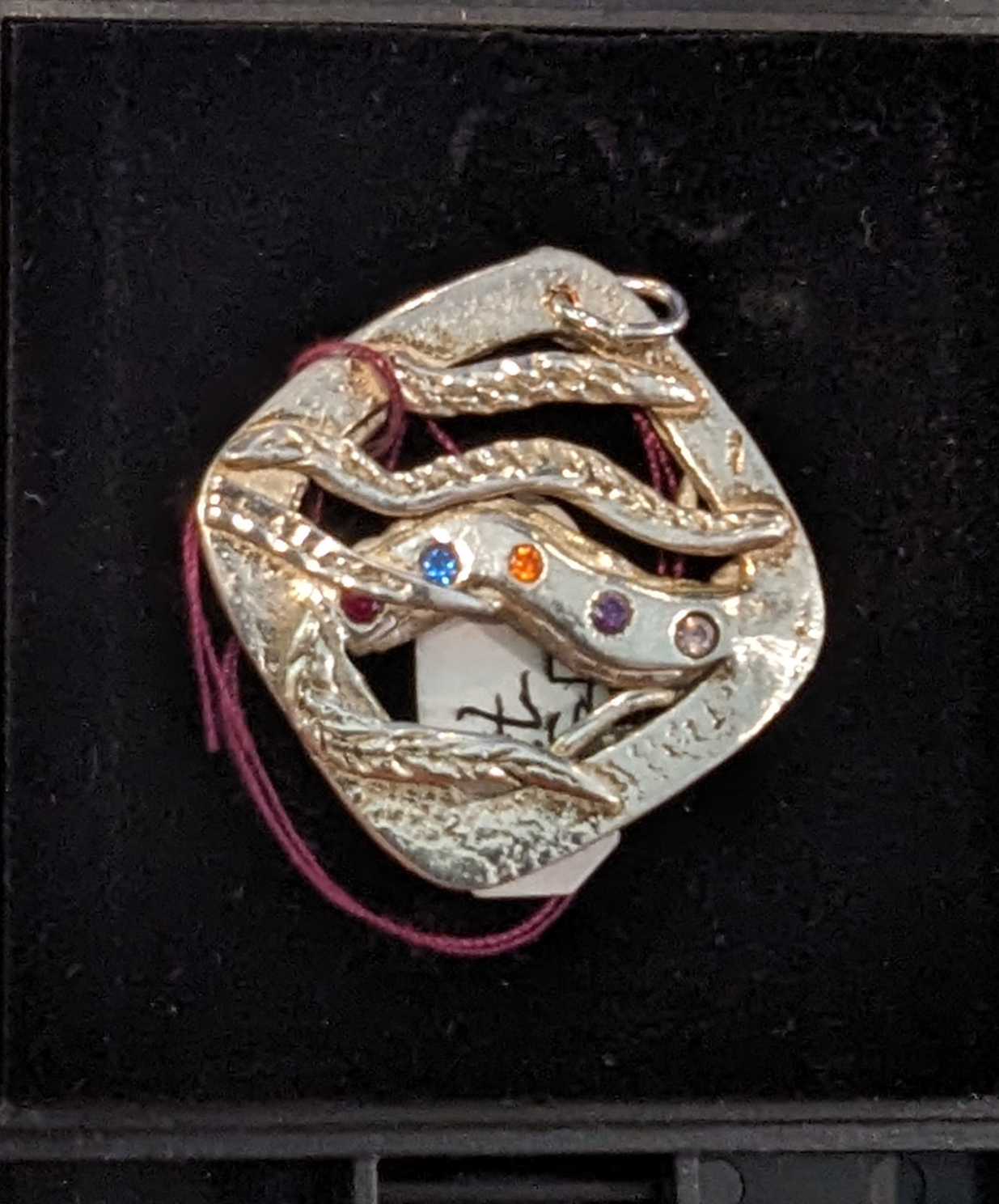 Colorful Cubic Zirconia. Lots of texture and little gemstones and it measures about 1 inch square.